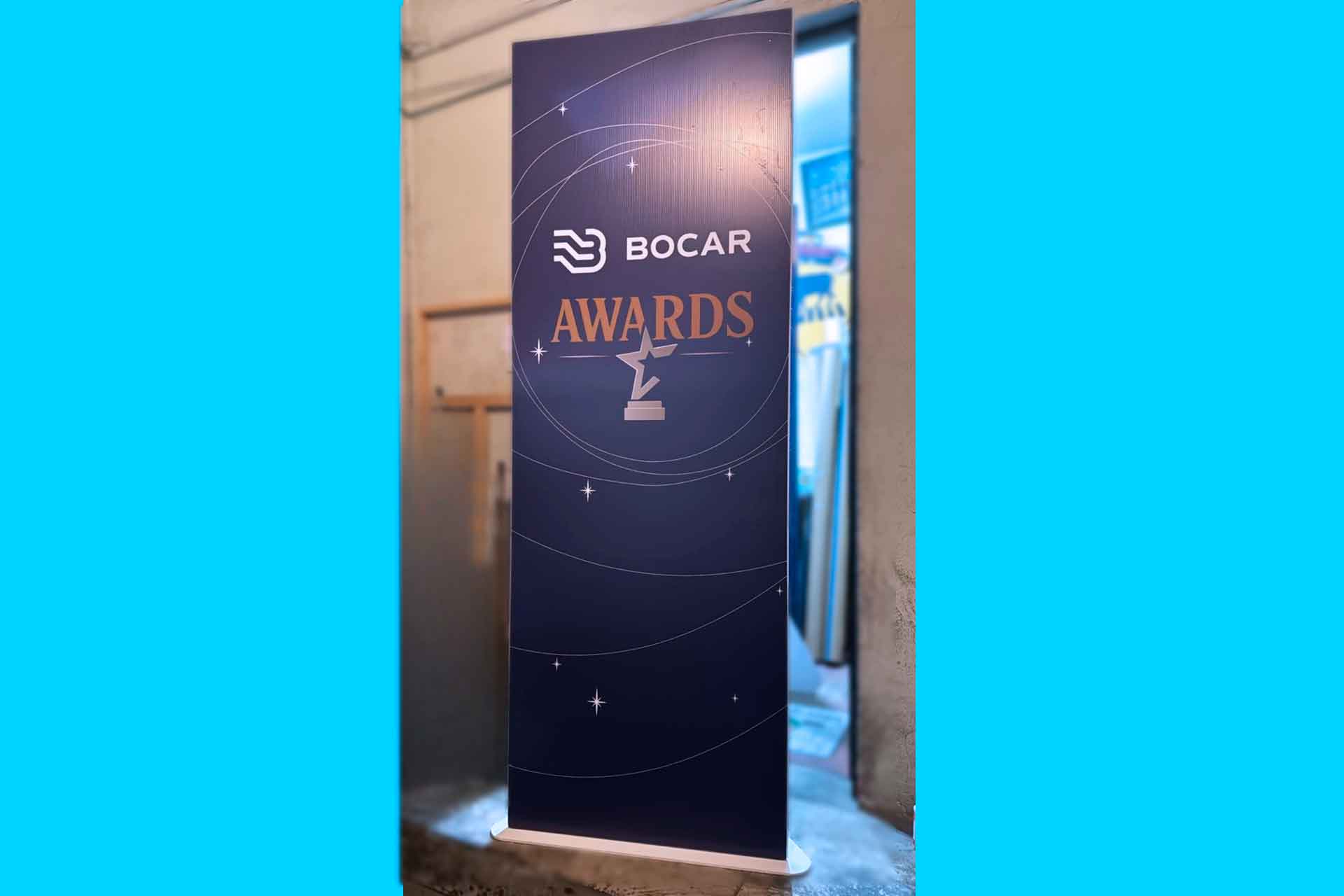 Display enrollable con impresión incluida. Se despliega fácilmente y es ideal para presentaciones, stands o puntos de venta.